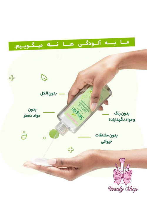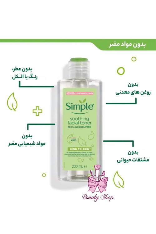 ویژگی تونر سیمپل تسکین دهنده انواع پوست 200 میل: زدودن باقی مانده آلودگی و ناخالصی ها پاکسازی قدرتمند و ملایم پوست متعادل کننده pH پوست سرشار از پرو ویتامین B5، بابونه، فندق جادوگر هیزل و آلانتوئین تسکین دهنده و آرامش بخش پوست تغذیه کننده و تقویت کننده پوست شاداب کننده و طراوت بخش پوست تست و تایید شده متخصصان پوستی مناسب پوست های حساس عدم آسیب به پوست و ایجاد تحریک و حساسیت فاقد مواد شیمیایی مضر، الکل، پارابن، فتالات، عطر و رنگ مصنوعی کاملا وگان و گیاهی بدون تست حیوانی مناسب برای انواع پوست